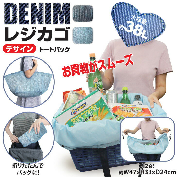 レジカゴバッグ デニム調 ブルー 大容量 38L レジカゴ レジかご エコバッグ 保冷 折りたたみ コンパクト おしゃれ 買い物 楽 手間 軽減