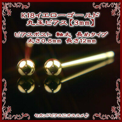 丸玉ピアス K18イエローゴールド丸玉ピアス 【3mm】【ピアスポスト軸太長めタイプ 太さ0.8mm長さ12mm】です。